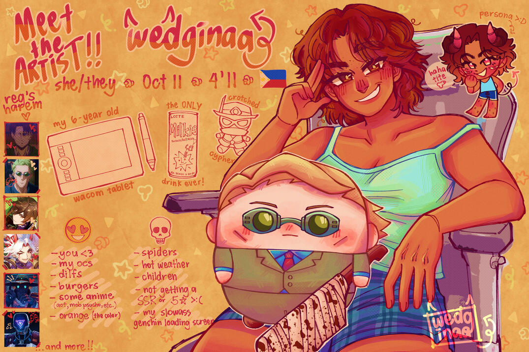Heyya !!! the name's wedginaa, but you can just call me reg :DDI love drawing my OCs and occasionally, fanart of all the various comics, series & games I enjoy.Aside from art, I usually play games or crochet to take a break from drawing or simply have fun and I also ramble a lot on Twitter!